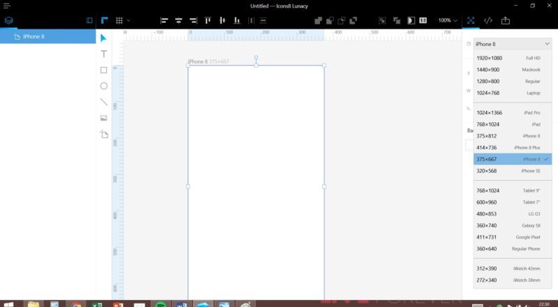 Uygulamayı bilgisayarınıza indirdikten sonra açtığınızda Photoshop'un biraz daha basit bir versiyonuyla karşılaşıyorsunuz diyebilirim. Benim karşıma çıkan sayfa iPhone 8'in boyutlarına göre hazırlanmıştı. Ancak Lunacy'nin sunduğu sayfa boyutları bununla sınırlı değil. Uygulama, kullanıcılarına masaüstü cihazlardan tabletlere ve mobil cihazlara kadar birçok boyut alternatifi sunuyor.