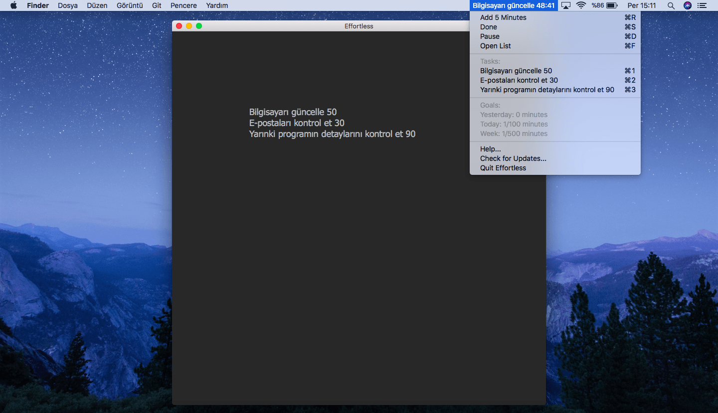 Effortless'ı açtığınızda karşınıza siyah bir ekran çıkıyor. O ekrana yapacağınız şeyi ve kaç dakikada yapacağınızı kısa bir şekilde yazıyorsunuz. Mesela "Toplantı notlarını gözden geçireceğim 40" yazıyorsunuz ve Mac'inizin sağ üst köşesinde notunuzla birlikte 40 dakikadan geriye sayan bir kronometre çıkıyor. Notlarınızı sınırsız bir şekilde artırabiliyorsunuz. Silmek istediğiniz notunuzu çöp kutusuna göndermek içinse yazdığınız cümleyi silmeniz yetiyor.