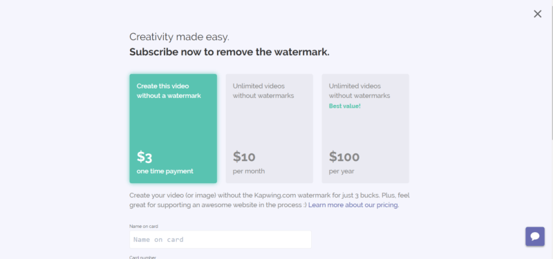 Eğer watermark barındırmayan bir videoya kavuşmak istiyorsanız Kapwing'in kurucuları düşük bir ücretle aracı kullanabileceğinizi ve bu esnada platforma destek olabileceğinizi ifade ediyor. Video başına 3 dolarlık bir ücret talep eden Kapwing'in aylık ve yıllık üyelikleri de mevcut. Aylık ve yıllık üyelikler ile sınırsız video içerikler üretebileceğini söyleyelim.
