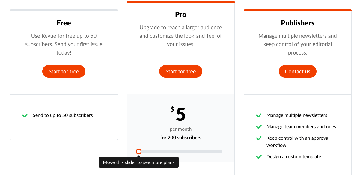 Revue'yu 50'ye kadar abone için ücretsiz olarak kullanabiliyorsunuz. Eğer daha fazla kitleye ulaşmak istiyorsanız bültenlerinizi özelleştirmek istiyorsanız aylık olarak minimum 5 dolar ödemeniz gerekiyor, fiyatı artırdıkça ulaşabileceğiniz özellikler de artmaya başlıyor. Birden fazla haber bültenini yönetmek istiyorsanız ücret için Revue yetkilileriyle iletişime geçmeniz gerekiyor.