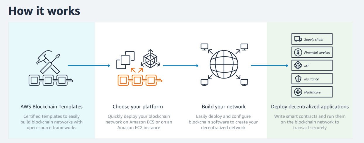 Orcle’ın Hyperledger platformu üzerine kurduğu açık kaynak bulut hizmeti duyurmasından altı ay sonra piyasaya çıkan AWS Blockchain şablonları, blockchain uygulamaları üzerinde çalışan kullanıcılara ethereum veya Hyperledger Fabric ağlarını daha kolay ve hızlı bir şekilde entegre etmesine olanak tanıyor. Yaklaşık bir yıl önce de IBM gene Hyperledger tabanlı blockchain as a service hizmetini duyurmuştu.