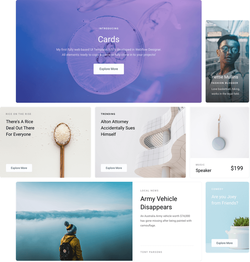 Tasarımcı ve girişimci Jan Losert çok sık kullandığı Webflow'un bu yeni özelliğini görünce hemen harekete geçerek ve bir internet sitesi geliştirirken ihtiyacınız olabilecek yüzlerce farklı elementi kullanılmaya hazır şekilde Cards adını verdiği bir tasarım setinde paylaşmış. Ücretsiz sunulan bu setin içerisinde formlar, menüler, üyelik sayfaları, ürün listeleme ve daha bir çok farklı element bulabiliyorsunuz.