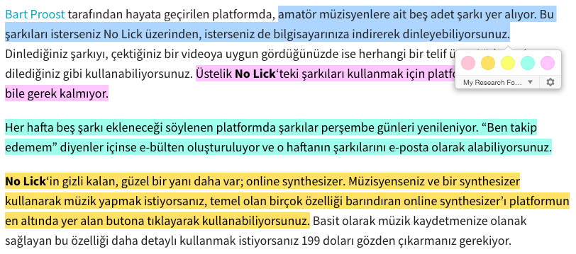 Birçok düzenlemeyi yapabileceğiniz Weava'da öne çıkarmak istediğiniz yazıları, tıpkı fosforlu kalemle üstünü çiziyormuş gibi renklendirebiliyorsunuz. Böylece hem istediğiniz yerleri daha kolay takip edebiliyor hem de makalenizi daha renkli bir hale getirmiş olabiliyorsunuz.