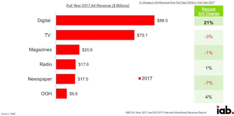 Interactive Advertising Bureau (IAB)'nin yayınladığı son rapora göre 2017 fikstür yılında dijital reklamlara yapılan toplam yatırım 88 milyar doları buldu. Bu, 2016 fikstür yılına göre %21'lik bir büyümenin olduğu anlamına geliyor. Büyüme ise en fazla mobilde gerçekleşti. Mobil reklamcılığın toplamda 49,9 milyar dolar bir harcama ile 2016 yılına göre %36 büyüdüğü ortaya çıktı.