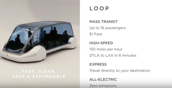 Elon Musk'ın yaptığı açıklamalara göre 16 kişilik yolcu kapasitesine sahip olacak Loop adındaki ulaşım projesi tamamen elektrikli olacak. Los Angeles şehir merkezi ile LAX havaalanı arasında yolcu taşıyacak olan Loop, yaklaşık 8 dakikalık bir ulaşım süresine sahip.