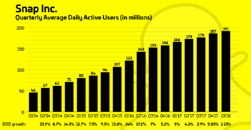 - Snapchat (tüm uygulama): Mayıs 2018 itibariyle 191 milyon günlük kullanıcı