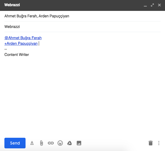 Gmail'de herhangi bir e-posta yazarken birini etiketlemek istiyorsanız yapmanız gereken, tıpkı Facebook, Instagram ve Twitter'da olduğu gibi kişinin kullanıcı adının başına @ simgesi getirmek. Kişi listenizdeki kişilerin listesini bu şekilde yazdığınızda e-postaya bir bağlantı eklenmiş olacak. Alıcı, bu bağlantıya tıkladığında yeni bir e-posta penceresi açacak, böylece bu kişi ile iletişim kurabilecek.