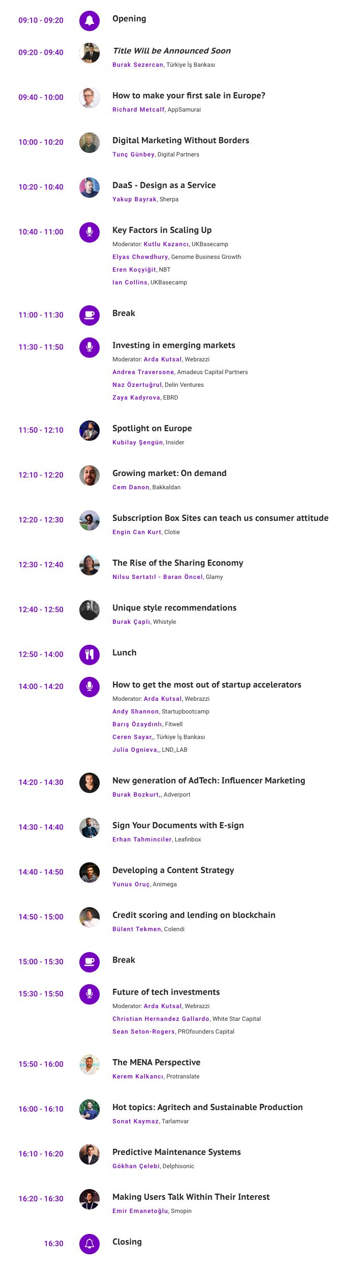 İş Bankası‘nın Bireysel Bankacılık ve Pazarlama Müdürü Burak Sezercan, Amadeus Capital Partners‘ın ortaklarından Andrea Traversone, Startupbootcamp‘in partneri Andy Shannon, Fitwell‘in kurucu ortağı Barış Özaydınlı, White Star Capital‘ın kurucu ortağı Christian Hernandez Gallardo, Genome Business Growth‘un kurucu ortağı Elyas Chowdhury, Arda Kutsal, NBT‘nin kurucusu Eren Koçyiğit, UKBasecamp‘in danışmanı Ian Collins, Protranslate‘in kurucu ortağı Kerem Kalkancı, Insider‘ın UK ve Avrupa yönetici direktörü Kubilay Şengün, UKBaseCamp‘in direktörü Kutlu Kazancı, Delin Ventures‘tan yatırımcı Naz Özertuğrul, PROfounders Capital‘da partner olan Sean Seton-Rogers, Digital Partners‘ın kurucu ortağı ve CEO’su Tunç Günbey, DAM-Startup Studio‘nun kurucusu ve CEO’su Yakup Bayrak ve EBRD‘den Zaya Kadyrova konuşmacılarımız olacağı Webrazzi Connect: London'da birbirinden önemli birçok konu da gündemimizde olacak.