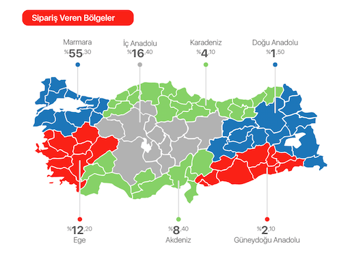 Sipariş verilen bölgelere baktığımızda yüzde 55'lik dilimle Marmara başı çekiyor. Marmara'yı yüzde 16 ile İç Anadolu, yüzde 12 ile Ege ve yüzde 8 ile Akdeniz izliyor. Yüzde 4 ile Karadeniz, yüzde 2 ile Güneydoğu Anadolu ve yüzde 1 ile Doğu Anadolu, en az sipariş verilen bölgeler olarak karşımıza çıkıyor. Siparişin en fazla olduğu ile ise yüzde 27 Avrupa, yüzde 22 Anadolu yakası olmak üzere yüzde 49'la İstanbul oluyor. İstanbul'dan sonra yüzde 10 ile Ankara ve yüzde 7 ile İzmir ikinci ve üçüncü en çok sipariş verilen şehirler oldu.