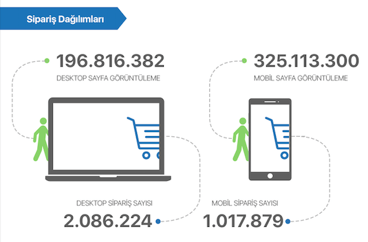 Raporu incelediğimizde, mobilin öne çıktığını söylememiz mümkün. Henüz sipariş anlamında olmasa da gezinmede mobil oldukça önde. 196 milyondan fazla görüntüleme web üzerinden gerçekleştirildiğini görürken, 325 milyondan fazla görüntülemenin mobil üzerinden gerçekleştirildiğini görüyoruz. Web üzerinden verilen sipariş sayısı 2 milyondan fazla iken, mobil üzerinden verilen siparişlerin sayısı da 1 milyonun üzerinde.