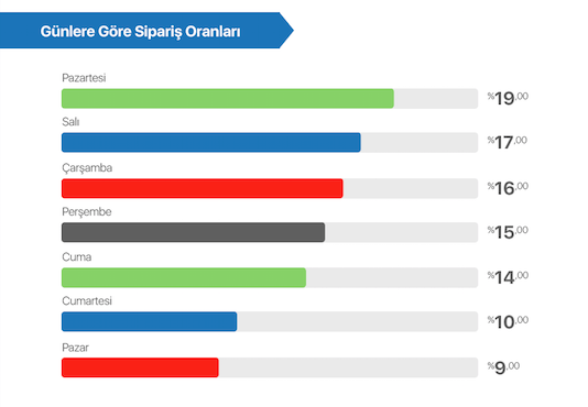Raporu incelerken mevsimlere göre sipariş raporunda da çok büyük değişkenlikler olmadığını fark ediyoruz. Yüzde 26 ile en çok sipariş verilen mevsim Sonbahar olurken, onu yüzde 25'erlik dilimlerle Kış ve İlkbahar izliyoruz. En az sipariş verilen mevsim ise yüzde 22'lik dilimle Yaz oluyor. Mevsimlerin yanında günlere göre sipariş oranı da dikkatimizi çeken bir başka unsur. Günlere göre siparişte, haftanın başından sonuna doğru bir düşüş olduğunu görüyoruz. Pazartesi günü yüzde 19'luk dilimle en fazla siparişin verildiği gün olurken onu, yüzde 17 ile Salı, yüzde 16 ile Çarşamba ve yüzde 15 ile Perşembe izliyor.