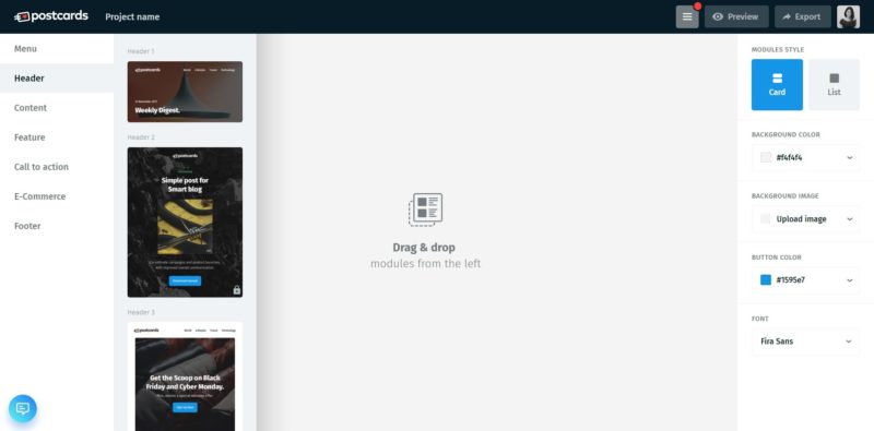 Header kısmında ise mailde kullanılacak alt başlıklara yer verilebiliyor. Postcards kullanıcılarına 8 farklı başlık tasarımı sunuyor. Bunların ise yalnızca biri ücretsiz olarak kullanılabiliyor.