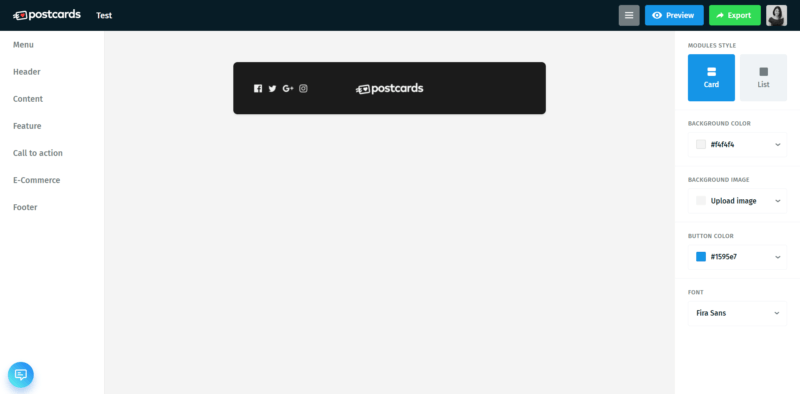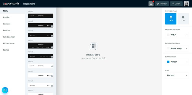 Responsive e-postanızı oluşturmaya panelde yer alan Menü seçeneğinden başlayabilirsiniz. Postcards bu başlık altında 10 menü farklı tasarımı sunuyor ancak ücretsiz olarak yalnızca bir tanesini kullanmanızın mümkün olduğunu belirtelim.