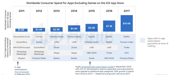 Aylık abonelik modeli de büyüyen bir trend ve bu trendin en büyükleri Netflix, Spotify, Pandora ve Tencent Video gibi içerik platformları. Buna ek olarak Tinder'da gelire göre dünyanın en büyük 5 uygulamasından biri olarak dikkate değer bir yer sahibi.