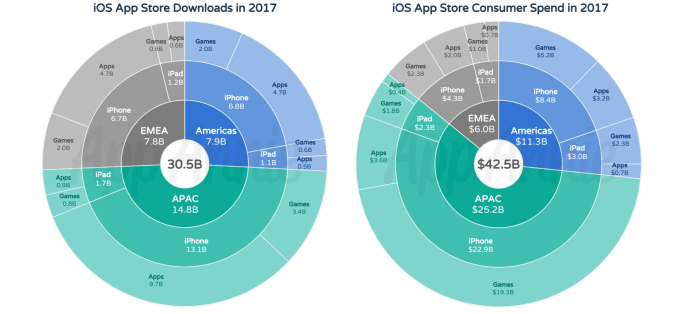 Rapordaki en can alıcı noktalardan birisi oyunlar. 2017 yılındaki indirilmelerin yalnızca %31'ini oyunlar oluştururken aynı oyunlar elde edilen gelirin yüzde 75'ini oluşturuyor. APAC bölgesi (Asya - Pasifik ülkeleri) oyun geliştiricilerin çok yakından incelemesi gereken bir bölge çünkü oyunlarda harcama yapanların ciddi bir bölümü buradan. 2017 yılında APAC bölgesinde 3.4 milyar defa oyun indirilmiş ve bu oyunlarda 19,3 milyar dolar para harcanmış.