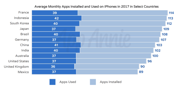 Fransa, Endonezya, Güney Kore, Japonya ve Brezilya gibi ülkeler aylık ortalama 100 uygulama kurarken bu uygulamaların ortalama 30-40 tanesini aktif olarak kullanıyor. Yani en çok uygulama indiren ve para harcayan ülkeler gerekten de uygulama kullanma konusunu çılgınlık haline getirmişler.