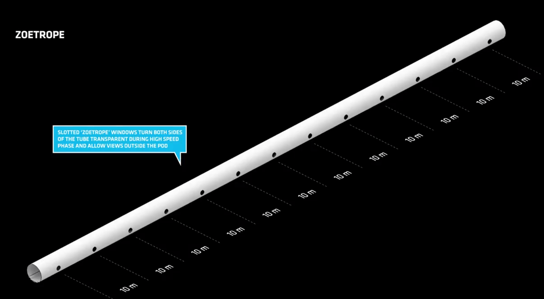How slotted ‘zoetrope’ windows could turn both sides of a hyperloop tube transparent, allowing views outside the pod. #BiennaleArchitettura2018 @BjarkeIngels pic.twitter.com/2aGGnMJgqv