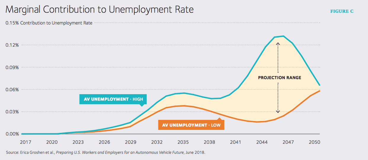 Otonom araçların istihdam üzerindeki etkisine yönelik yapılan simülasyonlar 2030 yılını temel alıyor olsa da asıl etkinin 2045 - 2050 yılları arasında olması bekleniyor. Bu en yüksek dönemde bile işsizliğe olan etkinin 0,06–0,13 puan arasında olması bekleniyor. Bu oranların, Bureau of Labor Statistics - Çalışma İstatistikleri Bürosu (BLS) tarafından hazırlanacak olan "işsizliğin nedenleri" raporlarında göz ardı edilecek kadar düşük bir oran olduğu belirtiliyor.