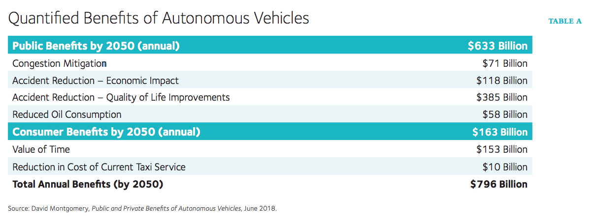 Yapılan projeksiyonlara göre otonom araçların sağlayacağı ekonomik faydanın 800 milyar doları bulması bekleniyor. Bu miktar sayesinde iş kayıplarına olumlu faydalar sağlanabilir. (Yeni iş alanları yaratılarak veya evrensel temel gelire destek sağlanarak yapılabilir.)