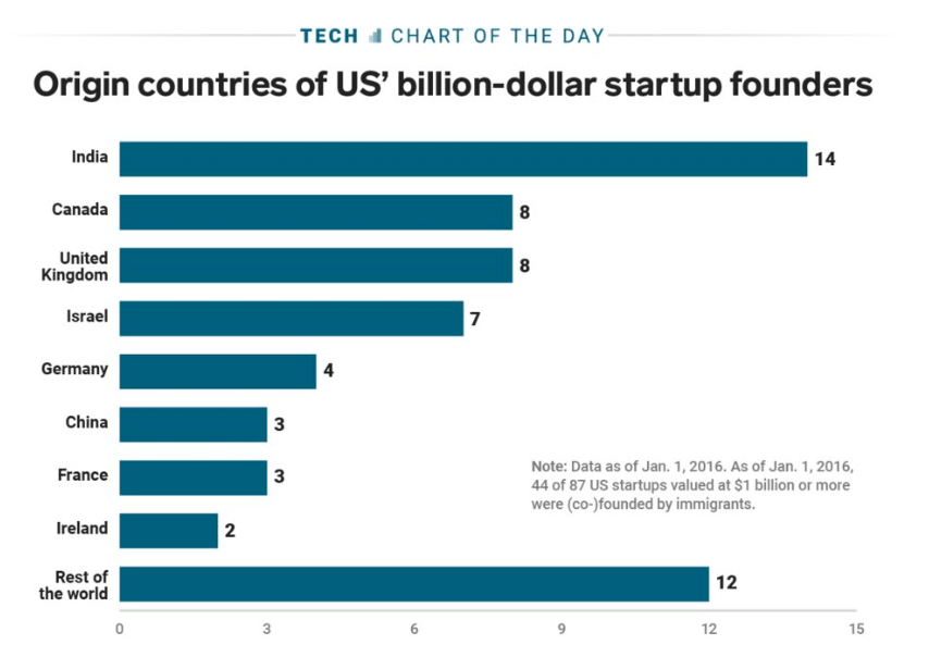 Statista'nın milyar dolar değerlemeli girişimler grafiğini incelediğimizde, Hindistan'ın 14 girişimci ile başı çektiğini görüyoruz. Onu, 8'er girişimci ile Kanada ve Birleşik Krallık, 7 girişimci ile İsrail, 4 girişimci ile Almanya, 3'er girişimci ile Çin ve Fransa, 2 girişimci ile İrlanda izliyor. Grafiğe göre, diğer ülkelerden gelip ABD'de milyar dolarlık girişimlerin kurulmasını sağlayan 12 girişimci bulunuyor.