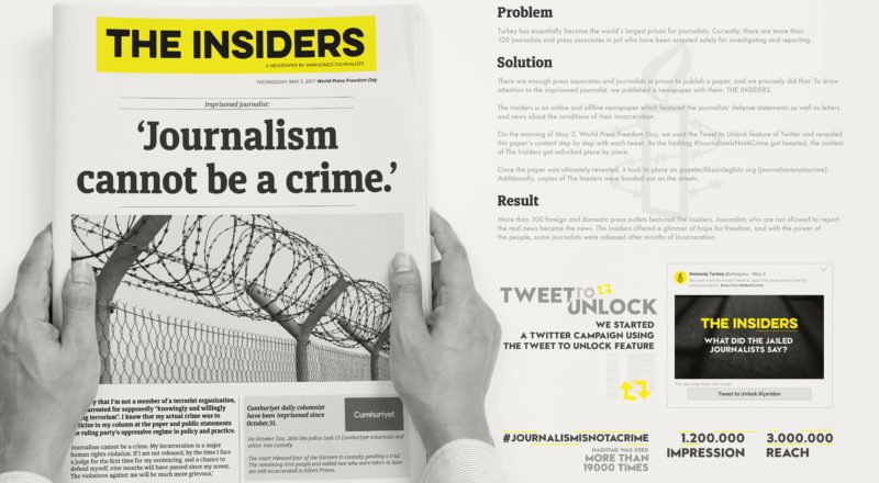Dün 4129Grey, Amnesty Türkiye için hazırladığı The Insiders (İçeriden) işi ile Cannes Lions Print & Publishing kategorisinde kazanan işler arasında yerini aldı. 4129Grey bu çalışmasında basın özgürlüğü üzerine çalışmalar yürüten Amnesty Türkiye için Türkiye'deki tutuklu gazetecilerle birlikte The Insiders gazetesini çıkarmıştı.