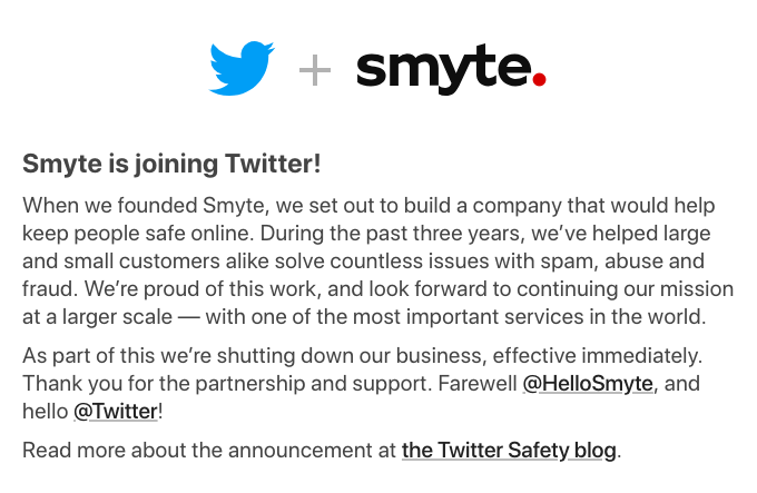 Symte, Twitter için gerçekten yararlı bir içerik olacak olsa da Twitter, Symte'in halihazırdaki müşterilerine sistemin API erişimlerini kapattı. Bu durum, Smyte'nin mevcut müşteri tabanını kendi platformlarının güvenliği ile ilgili üretim sorunları ile baş başa bıraktı. Hak verebileceğimiz üzere bu durumdan memnun olmayan müşteriler, bu durumu Twitter'a taşıdı.