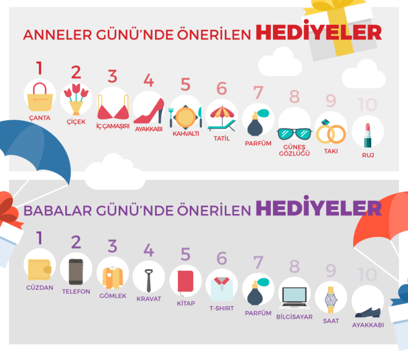 Markaların genel ve kişiye özel olarak düzenlediği kampanyalarda anneler için en çok tavsiye edilen hediyeler sırasıyla Çanta, Çiçek, İç Giyim, Ayakkabı, Kahvaltı, Tatil, Parfüm, Güneş Gözlüğü, Takı ve Kahvaltı olarak belirlendi. Markaların babalar için en çok önerdiği 10 hediye ise şöyle: Cüzdan, Cep Telefonu, Gömlek, Kravat, Kitap, T-shirt, Parfüm, Bilgisayar, Saat, Ayakkabı