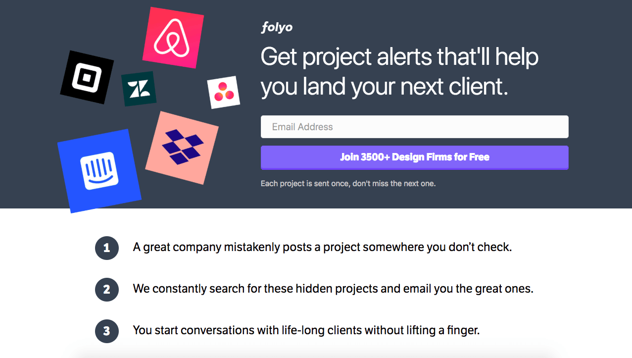 Folyo, tasarımcıların bulunduğu bir online topluluk olarak hizmet veriyor. Platformda projenizi yayınlıyorsunuz ve projenizi seçtikleri freelance tasarımcılara gönderiyorlar. Sizin için en iyi tasarımcıların kısa bir listesini oluşturuyorlar ve yeterli cevap aldıktan sonra, en uygun olanı size öneriyorlar. Folyo'ya bir proje göndermenin bedeli ise 99 dolar. Eğer bir tasarımcı bulamazsanız, tam bir geri ödeme ve bir sonraki projeniz için yüzde 20 indirim alıyorsunuz.