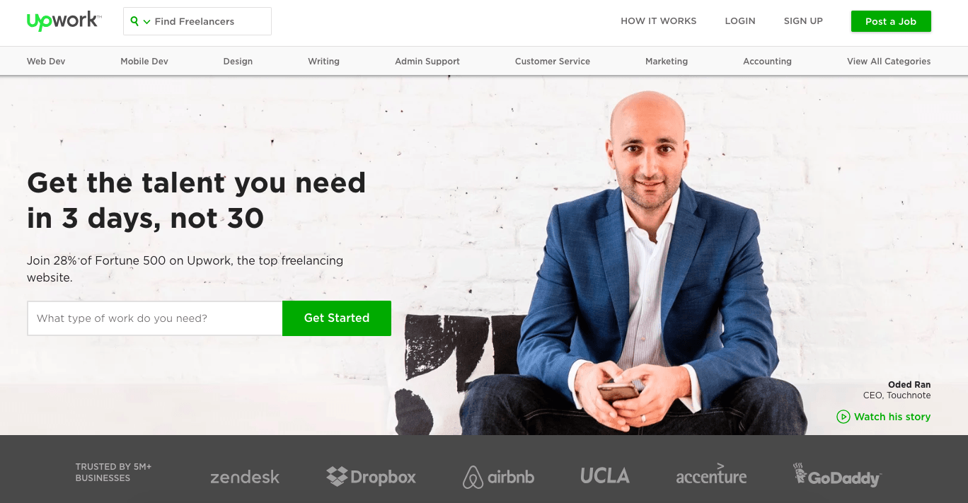 Upwork (eski adıyla oDesk), dünyanın en büyük serbest yetenek piyasası diyebiliriz. Vizyonları, işletmeleri her zamankinden daha hızlı bir şekilde büyük yeteneklerle birleştirmek olan Upwork, her büyüklükteki işletmeler, tek bir şirketten büyük şirketlere kadar, bir bilgisayarda yapılabilecek herhangi bir işin satın alınmasını sağlıyor. Upwork, aşağıdaki kategorilerde 2 bin 700'den fazla işi bünyesinde barındırıyor.