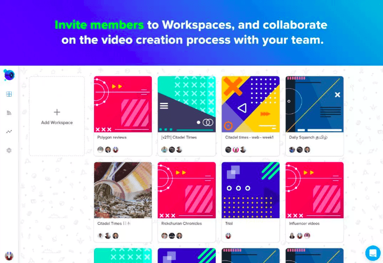 Workspace bir içerik yönetim sisteminden çok daha fazlası. Videonuz için 1.5 milyon farklı video ve fotoğraf bulabileceğiniz gibi platform üzerinde farklı farklı sahneler üzerinde çalışabilir ve videoyu beraber oluşturabilirsiniz. Kendi videolarınızı veya video formatlarınızı yükleyerek üzerinden de çalışmalarınızı ilerletebiliyorsunuz.
