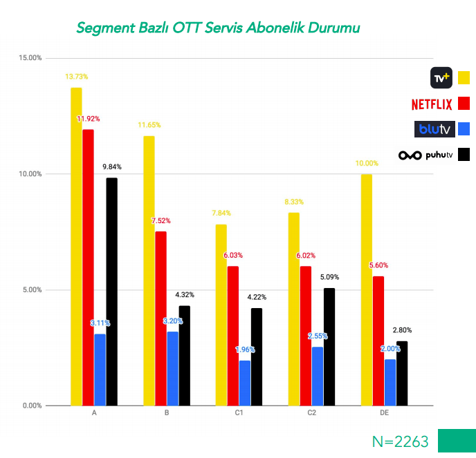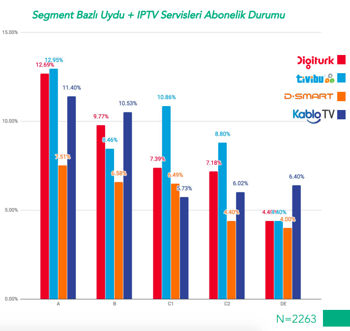 Yeni nesil OTT ve IPTV servislerinde Türkiye’de en yüksek penetrasyon oranına sahip servis Turkcell TV+oldu. Rapora göre Digitürk, Tivibu ve Kablo TV'nin uydu/IPTV alanında pazar liderliği için rekabet içerisinde olduğu anlaşıldı. Hanelerdeki uydu ve IPTV bazlı medya dağıtım servislerinin kullanım oranları incelendiğinde, A grubunda Tivibu ve Digitürk’ün lider olduğu, diğer SES gruplarında ise Kablo TV, Tivibu ve Digitürk’ün büyük bir rekabet içinde olduğunu görüyoruz. Bununla beraber, tüm markaların abonelik oranları, hanenin ekonomik gücü ile paralel bir şekilde düşüş içerisinde diyebiliriz.