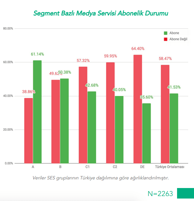 Araştırmaya göre Türkiye’de medya servisi abonelik oranı yüzde 41,53 olarak açıklandı. Sosyo-Ekonomik Statü(SES) gruplarına göre kırılıma göz atıldığında, en yüksek abonelik oranı yüzde 61,14 ile SES A grubundaki hanelerde iken, en düşük abonelik oranı da yüzde 35.60 ile SES DE gruplarındaki haneler oldu. Buradan hanelerin ekonomik seviyesi düştükçe, abonelik oranında bir düşüş olduğunu görebiliyoruz.