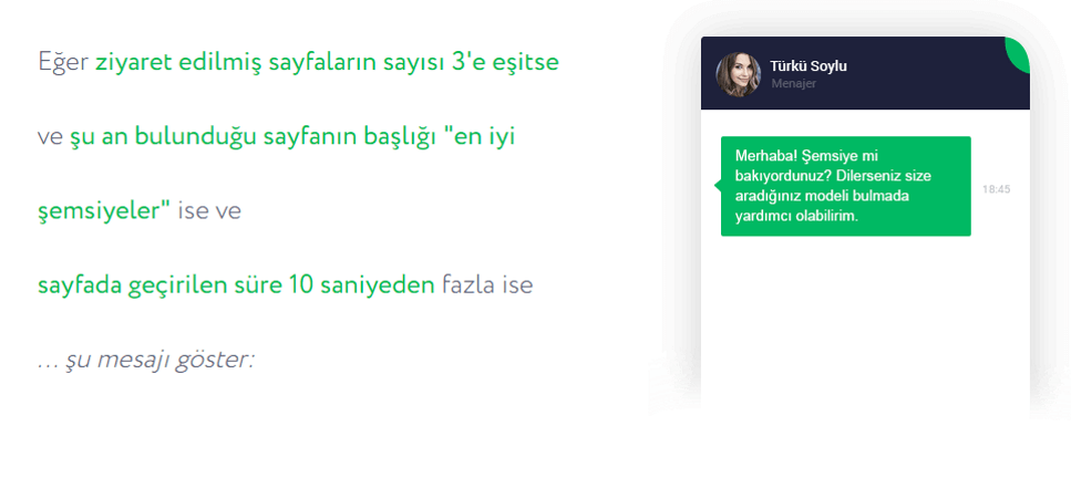 Akıllı tetikleyiciler adını verdikleri sistem ile, belirlediğiniz koşullar sağlandığında otomatik mesaj gösterebilmenizi sağlayan JivoChat, satışları artırmada en büyük etkiyi bu özelliğin yaptığını belirtiyor. Örneğin, ziyaretçi sitede bir ürünü sepete attı ve satın alma sayfasına gitti, ancak 20 saniyedir işlem yapmıyorsa, şu mesajı göster : “Merhaba, en beğenilen ürünlerimizden birini seçmişsiniz, harika! Size bir yüzde on indirim verelim, güle güle kullanın, ne dersiniz?” şeklinde tetikleyiciler belirleyebiliyorsunuz. Bu sayede nerede, hangi müdahaleyi yapacağınızı otomatikleştirebiliyorsunuz.