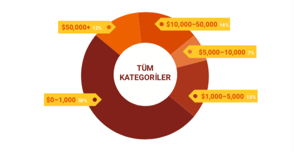 Araştırmada yer verilen sektörlerin yarısı reklamlar için 1.000 dolar veya daha az bir miktar harcadığını belirtiyor. İkinci en yüksek toplam reklam harcamaları aralığı, yüzde 16 ile 10.000 dolar ile 50.000 arasında yer alıyor. 1000 dolar ile 5.000 dolar aralığında yapılan harcama oranı ise yüzde 15 ile üçüncü sırada. Dördüncü en yüksek toplam reklam harcamasının yüzde 12 ile 50.000 dolar ve üzeri olduğunu belirtelim. Raporda 5.000 ile 10.000 dolar arasında harcama yapanların oranı ise %7.