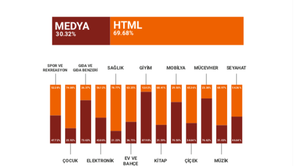 Raporda yer alan veriler, HTML biçiminin tüm e-ticaret display reklamlarının yaklaşık yüzde 70’ini temsil ettiğini gösteriyor. Üstelik HTML biçimi, yüzde 30 civarında olan standart medya reklam türünü çok geride bırakıyor.