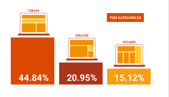 Sektörde yüzde 44,84 oranıyla leaderboard boyutunun (728x90) tercih edildiği görülüyor. 300x250 formatı ise yüzde 20.95 ile leaderbord'u takip ediyor. Bu arada 300x250 formatının, Google tarafından belirlenen en iyi performans gösteren reklam boyutlarından biri olduğunu belirtelim. 160x600 boyutundaki reklamlar ise, tüm reklam panolarının yüzde 15,12'sini oluşturuyor.