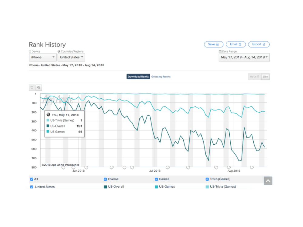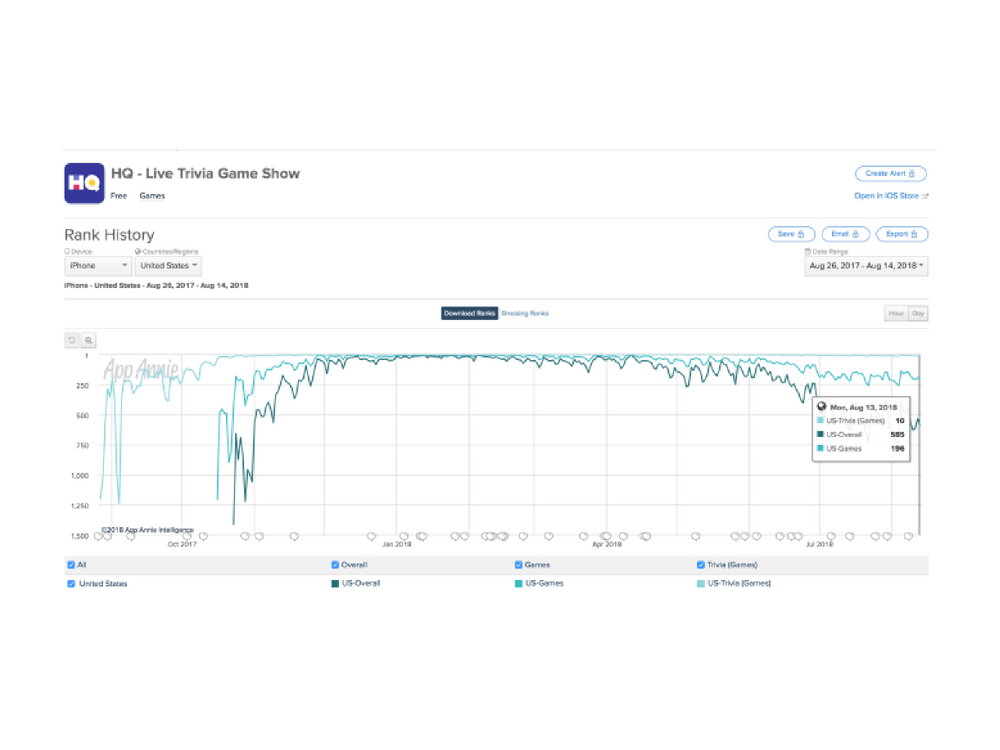 App Annie’nin app store verilerine göre, iOS bilgi yarışmaları arasında ABD'de birinci sıradan 10. sıraya düşen HQ, 44.üncü sıradan 196.ıncı sıraya ve son olarak tüm uygulamalar arasında 151.inci sıradan 585.inci sıraya düştü. Üstelik benzer bir düşüşü Android tarafında da gösterdi. Araştırma firması Sensor Tower, HQ'nun tekil kullanıcılar tarafından şimdiye kadar toplam 12,5 milyon indirme aldığını belirtiyor. Bu indirmelerin yüzde 68'i ise iOS üzerinden geliyor. Bir süredir düşüş yaşayan ve geçtiğimiz ay 560 bin indirme alan HQ, Şubat ayından beri ay başına 2 milyondan fazla bir düşüş yaşamakta.