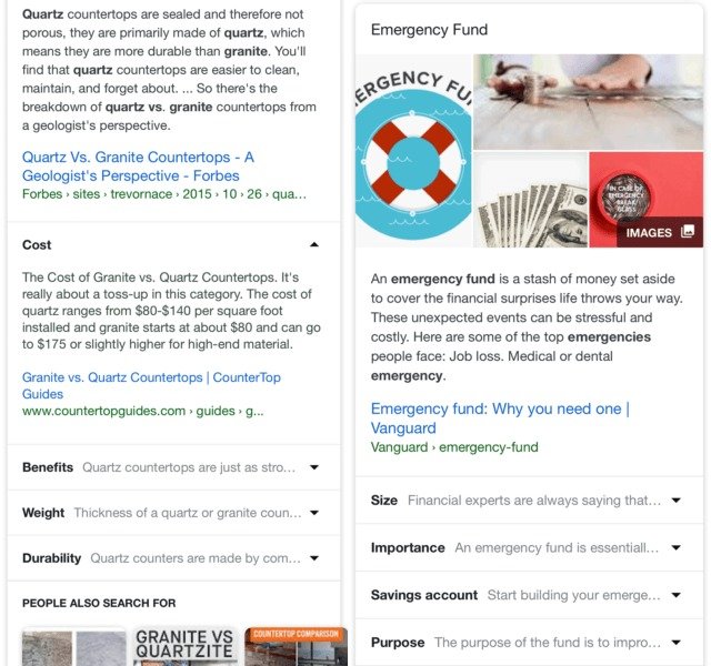 Örneğin, kuvars ve granit taşlarını kıyaslamalı olarak ararsanız resimlerle birlikte ana özellikli snippet'i, ardından maliyetler, avantajlar, ağırlık ve dayanıklılık ile ilgili fikirleri göstermek için genişletilebilecek dört ek özellikli snippet'leri elde edeceksiniz. Bu konular, Google'ın algoritmalarının bu konu hakkında ne anlama geldiğini temel alarak otomatik olarak seçiliyor. Bu güncelleme, arama ile hızlı bir şekilde bilgi alınmasına yardımcı olmak için yapılan bir dizi iyileştirme işlemi diyebiliriz.