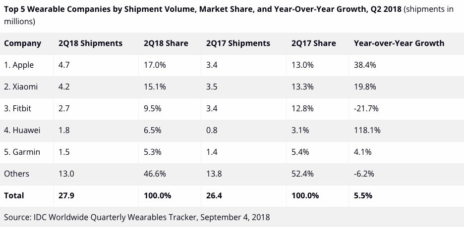 Apple ve Xiaomi arasında satış ve pazar payı anlamında pek fark olmasa da listenin üçüncü sırası ile birlikte aradaki makas açılıyor. Listenin üçüncü sırasında yer alan Fitbit, yılın ikinci çeyreğinde 2,7 milyon satış yapmayı başardı. Geçtiğimiz yılın aynı döneminde pazarın yüzde 12,8'ine sahip olan Fitbit, 2018'in ikinci çeyreğinde ise pazarın sadece 9,5'ine sahip durumda.