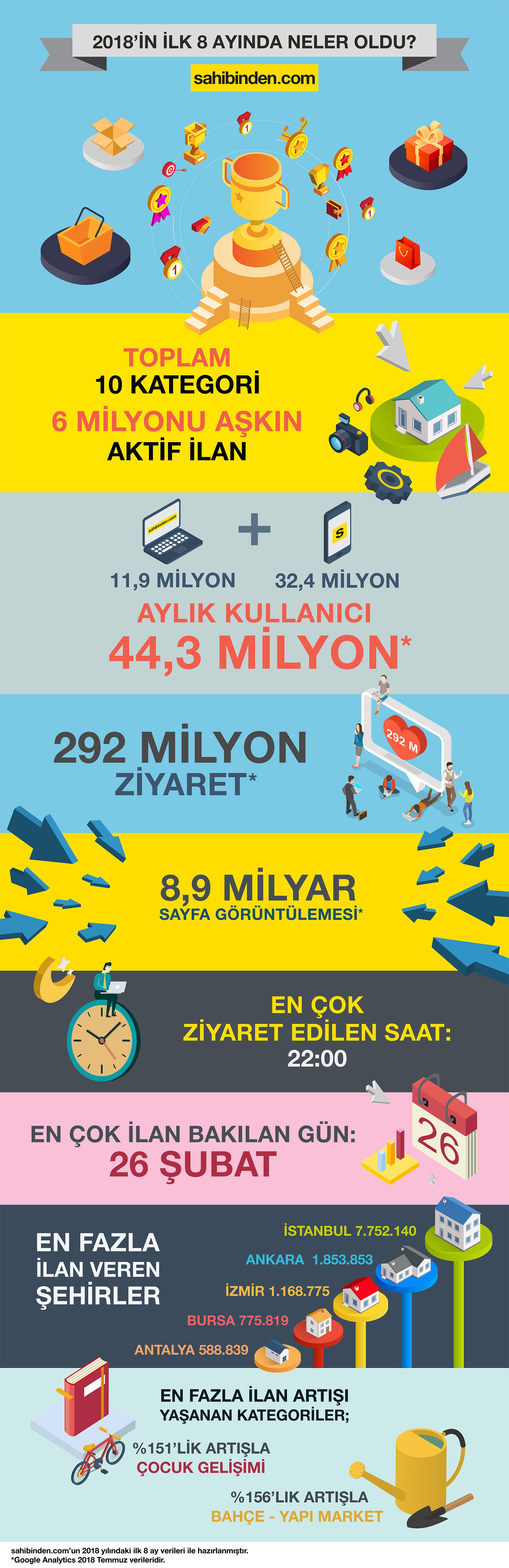 Ağustos ayında Sahibinden.com’da toplam 10 kategoride, yaklaşık 6 milyon aktif ilan yer aldı. Google, Youtube, Facebook, Twitter ve Instagram gibi sosyal medya platformlarından sonra Türkiye’nin en çok ziyaret edilen internet platformu olan Sahibinden.com, aylık 292 milyon ziyaret ve 8,9 milyar sayfa görüntülemesi ile Similarweb verilerine göre dünyanın en büyük 4. online ilan platformu oldu.