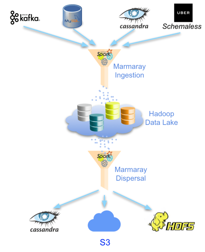 Uber'in Hadoop platformu ekibi bu probleme çözüm olabilmesi açısında açık kaynak kodlu Marmaray projesini hayata geçirdi. Tahmin edebileceğiniz gibi adını Asya'yı Avrupa'ya bağlayan Marmaray projesinden alan bu açık kaynak kodlu kütüphane, temel olarak farklı Hadoop platformuna farklı kaynaklardan gelen farklı formatlardaki veriyi aktarma sürecini kolaylaştırıyor.