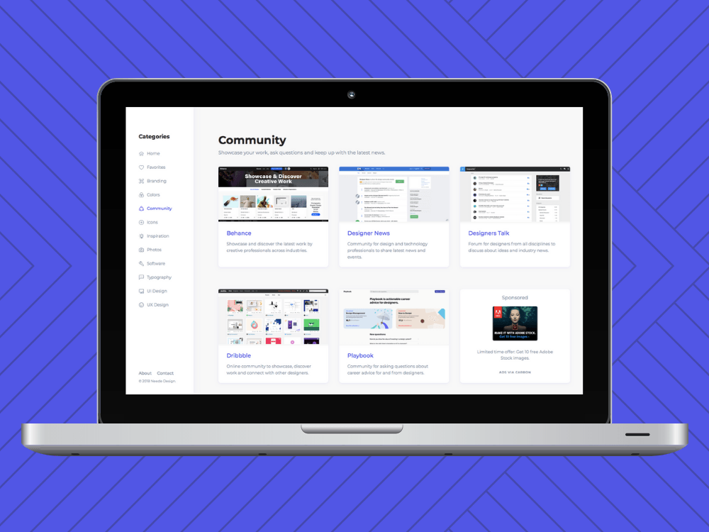 Neede'de sunulan kategoriler, kurumsal kimlik, renkler, topluluk, ikonlar, ilham kaynakları, fotoğraflar, yazılım, tipografi, UI tasarım ve IX tasarımını kapsıyor. Kategorilerde sadece belirtilen konularda hizmet veren sitelerin yanı sıra bu konu başlıklarının yönetilebilmesini sağlayan araçlara da yer veriliyor.