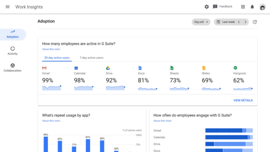 Yöneticiler Work Insights'ı kullanarak, hangi ekiplerin birlikte çalıştığını, dokümanların çalışan kullanımıyla veya Google'ın Hangouts sohbet ve video aracıyla yapılan toplantıları da görebilecekler. Kısacası araç, yöneticilerin, çalışanların aslında Gmail gibi G Suite verimlilik uygulamalarını, belge oluşturma ve paylaşma için Dokümanlar, e-tablolar için E-Tablolar veya sunumlar için Slaytlar gibi uygulamalarını kullanıp kullanmadığını görme olanağı sağlamış olacak.
