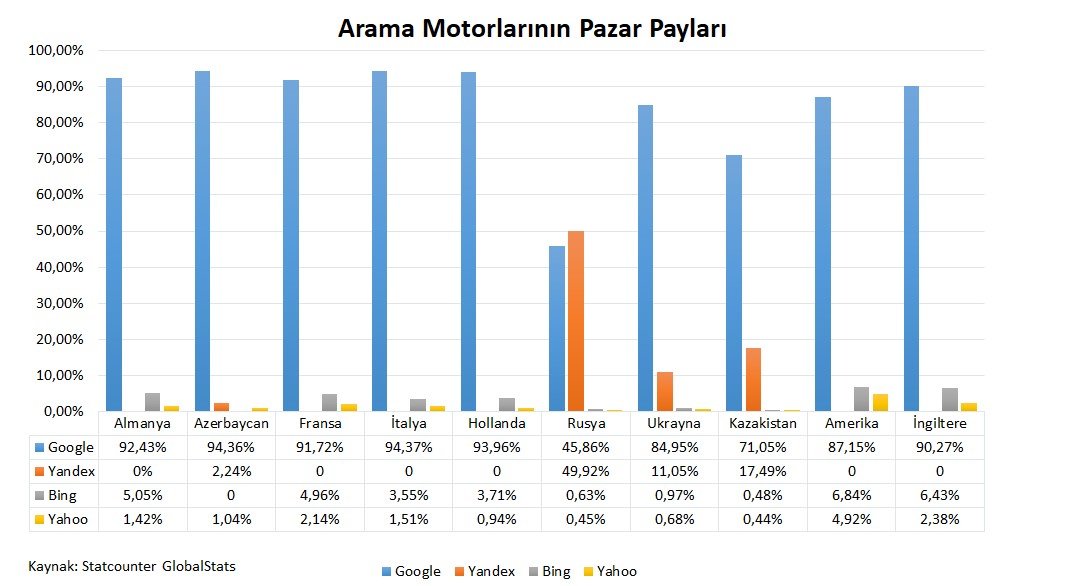 Yukarıdaki grafikte 2017-2018 yılları arasında ülkelere göre arama motoru pazar payları verilmiştir. Grafikteki değerlere baktığımızda Almanya, Azerbaycan, Fransa, İtalya, Hollanda, Ukrayna, Kazakistan, Amerika ve İngiltere’de Google arama motorunun, Rusyada Google arama motorunun yanı sıra Yandex’in de aktif olarak kullanıldığı görülmektedir. Buna göre çoğu ülkede Google reklamlarını uygularken, Rusya’da iki ayrı arama motorunda reklam yapılmalıdır.
