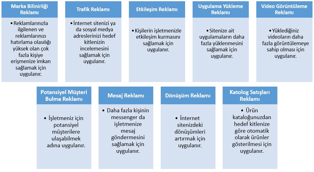 Sosyal medya da daha fazla kitleye ulaşabilmek için ücretli reklam yapabilirsiniz. Facebook reklam alanında çok çeşitli kampanyalar oluşturma imkanınız bulunmaktadır Örnek olarak aşağıdaki tabloda E-İhracat işletmelerinin Facebook da ne tarz reklamlar yapabileceği belirtilmiştir.