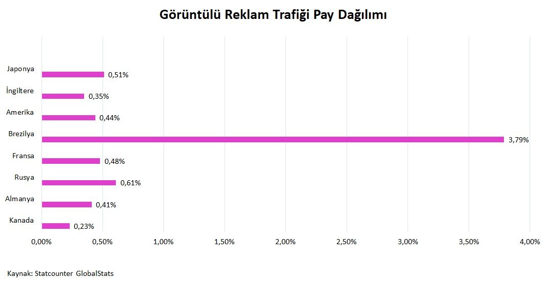 Sıklıkla uygulanan reklam türlerinden biri olan görüntülü reklamlar ile sitenize trafik çekebilirsiniz. E-İhracat işletmelerinin görüntülü reklam yapabilmeleri için hedef ülkedeki ziyaretçi sayısı çok olan siteleri araştırması ve bu sitelere uygun reklam görselleri hazırlayarak yayınlanmasını sağlaması gerekmektedir. Ücretli reklam türlerinden biri olan görüntülü reklamları daha çok markanızı tanıtmak için kullanabilirsiniz. Aşağıdaki grafikte görüntülü reklam payı açısından en yüksek trafiği alan ülkeleri görebilirsiniz.