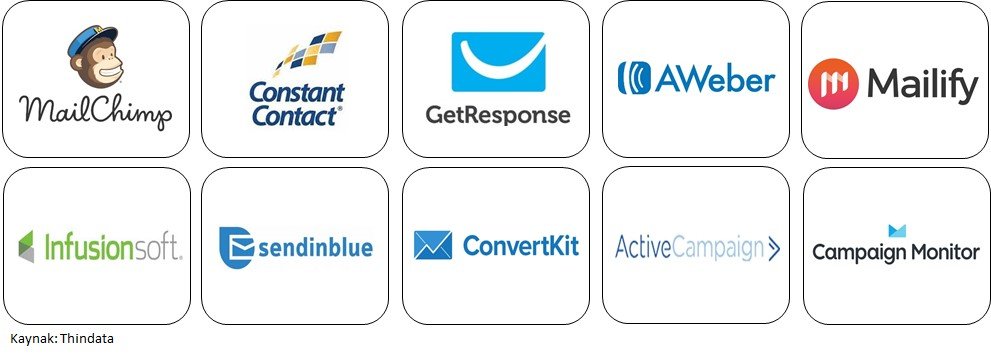 Çevrimiçi pazarlama yöntemlerinden biri olan e-posta pazarlaması ile gönderim izni vermiş kişilere e-posta göndererek indirimlerden, kampanyalardan ya da değişikliklerden haberdar edebilir ve böylece sitenize trafik sağlayabilirsiniz. E-posta pazarlaması maliyeti diğer kanallara göre düşük, geri dönüşümü en yüksek ve en önemli pazarlama kanallardan biridir. Ancak verimli ve yeterince büyük bir izinli e-posta veritabanı oluşturmak için zamana ve pazarlama çalışmalarına ihtiyaç duyacaksınız. Aşağıdaki tabloda sık kullanılan e-posta pazarlama araçları verilmiştir. Bu araçları kullanarak e-posta pazarlaması yapabilirsiniz.