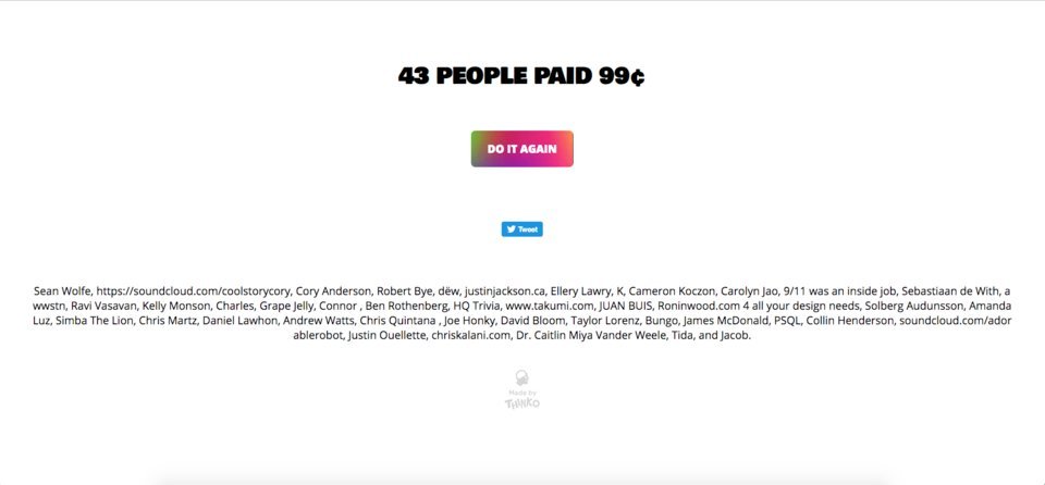 Müşterileri arasında Tumblr ve Vice gibi firmaların yer aldığı Thinko tarafından üretilen sitenin ilk bakışta ya yeni bir yaklaşımı test ettiğini ya da girişim ekosistemine hicvettiğini düşünüyorsunuz. Üstelik Who Paid 99 Cents'in insanların aklını çeldiğini söylemek de mümkün.