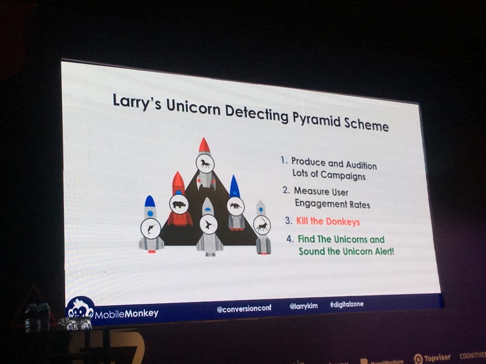 Larry pazarlama kampanyalarını unicorn ve donkey benzetmeleriyle açıkladı. Pazarda unicorn olmuş yani başarılı bir pazarlama kampanyası yürütmüş olan kampanyaları inceleyerek işe başlamamızı söyleyen Larry, geleceğin pazarlama stratejilerinin “kazanan hepsini alır” noktasına evrildiğinin altını çizdi. Unicorn içeriklerimizi donkey içeriklerimizden ayırmak için CTR yani tıklanma oranlarını göz önünde bulundurabileceğimizi söyleyen Larry, yüksek CTR’ların yüksek dönüşüm oranı getireceğini ekledi.