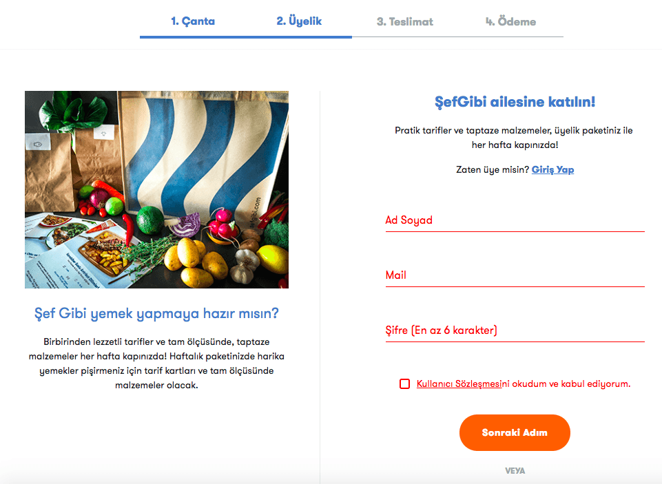 Öncelikle platformun haftalık olarak hizmet verdiğini yeniden hatırlatalım. İlk olarak ŞefGibi'nin kendi web sitesine girip sağ üst köşede yer alan "Çantanı Oluştur" seçeneğine tıklıyorsunuz. Akabinde karşınıza yemek tercihinize ve haftada kaç paket istediğinize göre hazırlanmış kategoriler çıkıyor. Haftada iki veya üç kere paket alabileceğiniz tercihi seçtikten sonra beslenme türünüze göre olan Etobur, Vejetaryen, Akdeniz Diyeti veya Karışık seçeneklerinden birini işaretliyorsunuz. Tüm paketler iki kişilik olarak gönderiliyor. 2 gün için seçtiğiniz paketin tutarı 120 TL iken, üç günün paketi 130 TL olarak ücretlendiriliyor. Paketinizi hangi gün ve saatte alacağınızı siz belirliyorsunuz ve istemediğiniz haftalarda dondurma işlemi gerçekleştirebiliyorsunuz. Üyeliğinizi de istediğiniz zaman iptal edebiliyorsunuz.